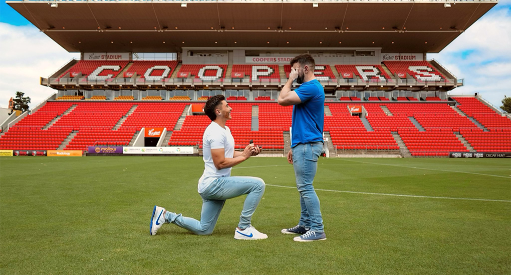 Josh Cavallo is an Australian A-League Men player for Adelaide United and one of the few out professional players. In his engagement post, Cavallo is seen on one knee on the pitch at the club’s Hindmarsh Stadium home.