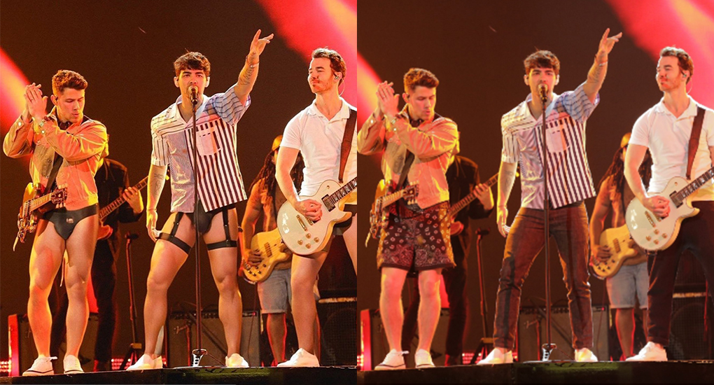 A post appeared on DNA’s Instagram explore page which naturally caught our attention! It was the Jonas Brothers performing in their underwear! Upon inspection, the photo is an old, doctored one and the original is from their rehearsal in 2019 for the Billboard Music Awards.
