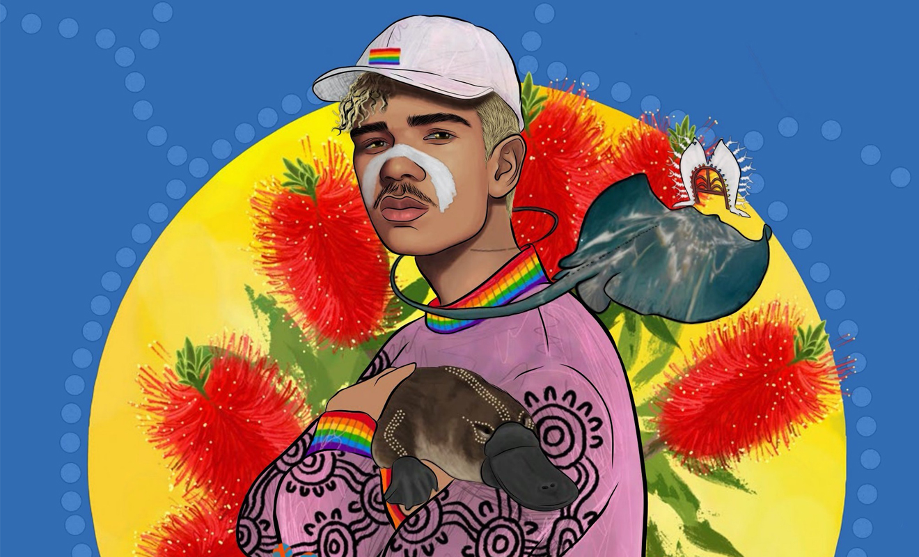 Dylan, 24, identifies as a queer Yuibera man from Mackay in Central Queensland and a Torres Strait Islander man from Badu and Darnley Islands. Many of his personal works show the pride rainbow flag dancing across the collars and sleeves of embracing Indigenous men. Other pieces draw on political motifs and family history, and themes of institutionalised racism and the mistreatment of the land.